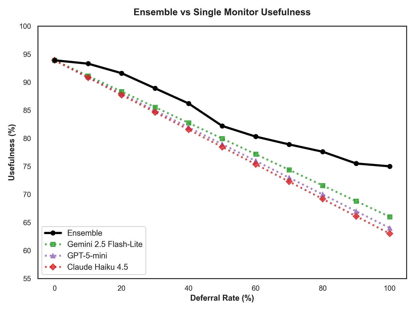 Prior work also shows that ensembling multiple model outputs improves accuracy on standard, non-adversarial tasks like text classification. Unfortunately, here it had little to no impact on safety. I found that averaging scores worked best, though all aggregation methods performed similarly. The monitors’ mistakes were highly correlated and so the ensemble was only ever as good as our best monitor, or as bad as our worst.
